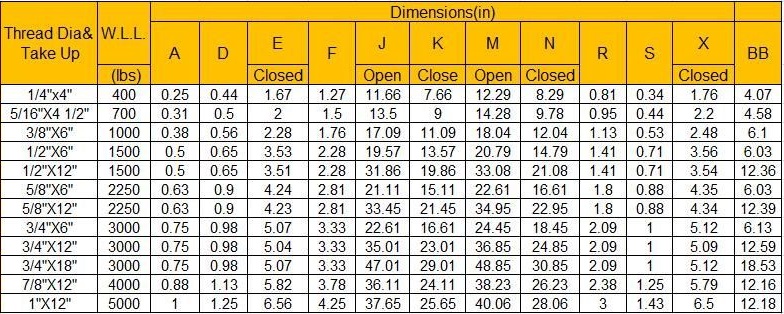 • Size embossed on each turnbuckle.